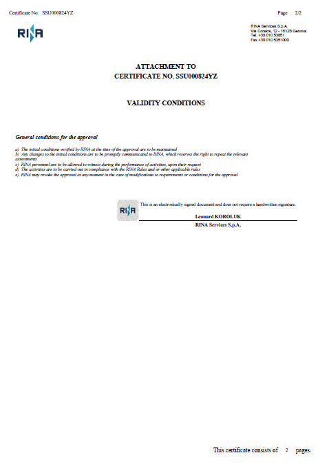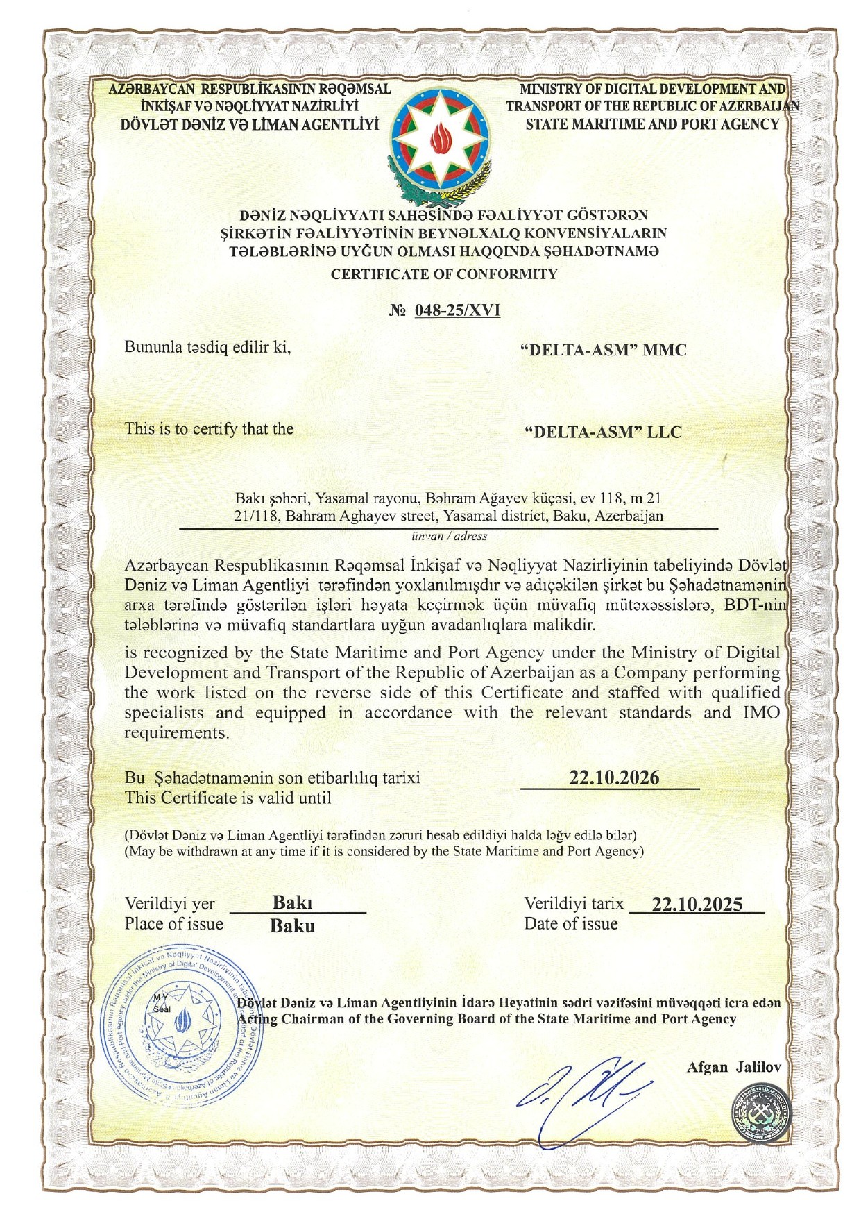 The Company has Russian Marine Register Certificate, Recognition Certificate of testing laboratory by RMRS, Airborne Asbestos Fibers Samples Analyses Report; Classification certificate, Certificate of entitlement to fly the flag of the republic of Azerbaijan, Minimum safe manning Certificate, Seaworthness certificate by the State Maritime Administration Of Azerbaijan Republic, TWI Certificates for welding procedures, QSI.